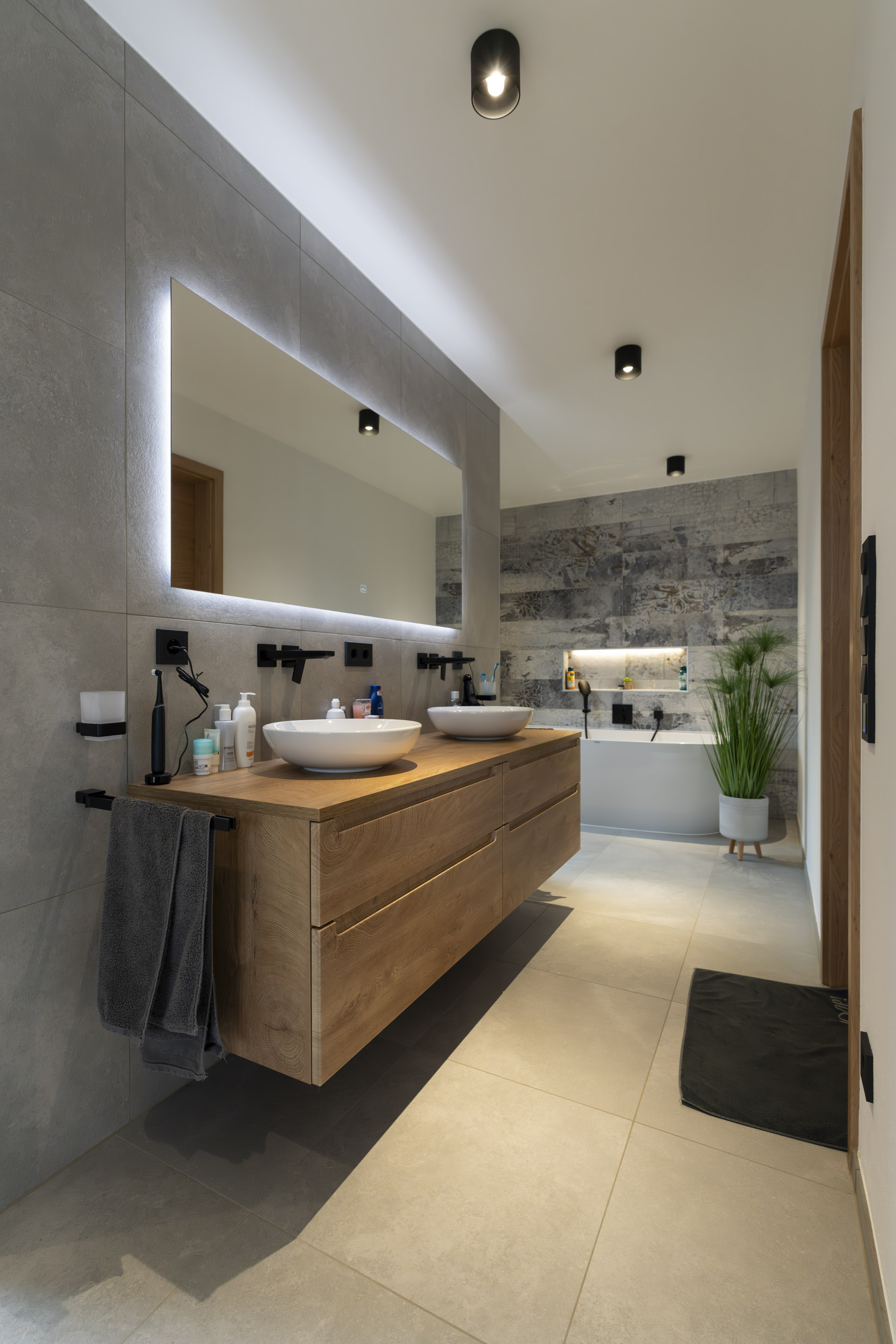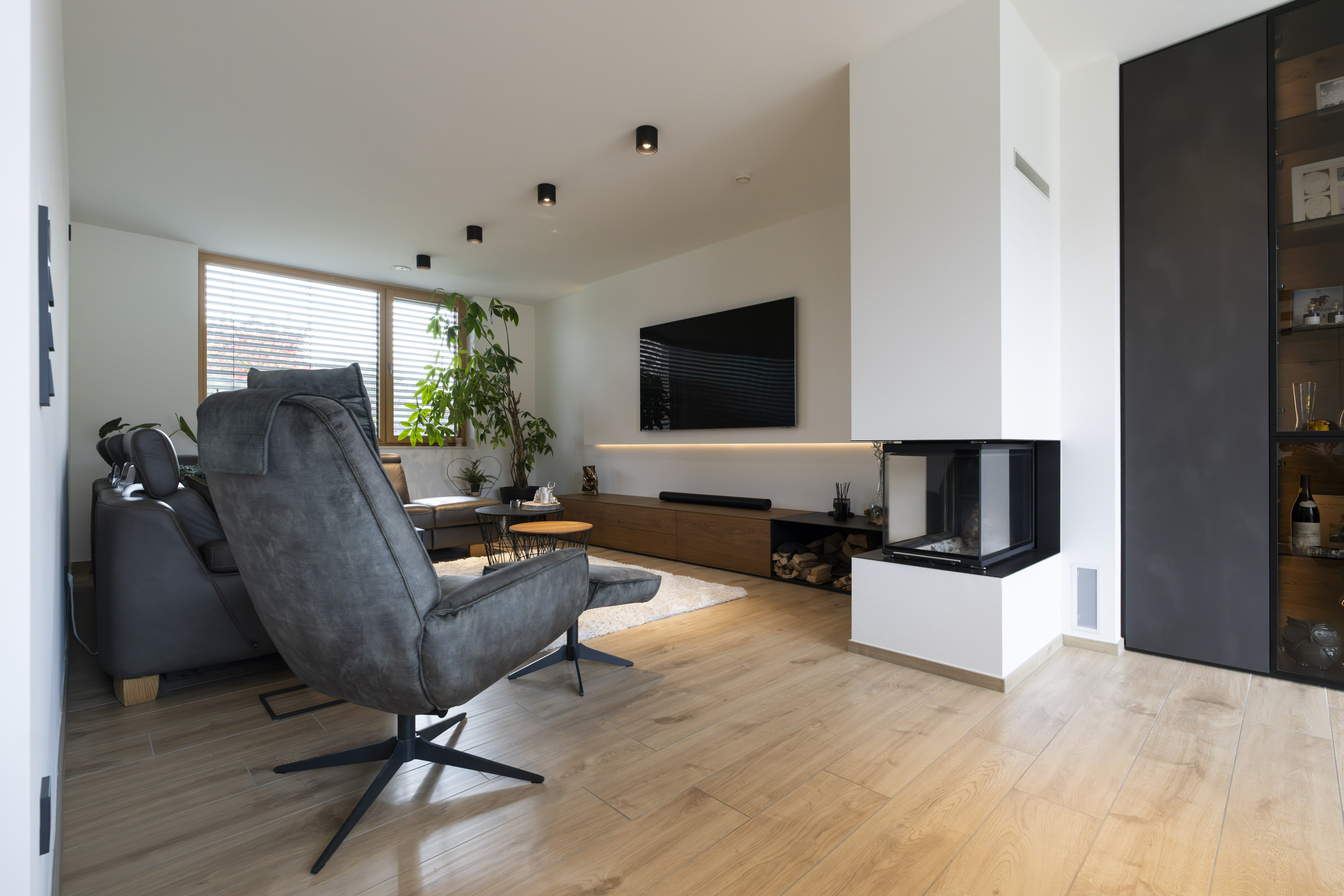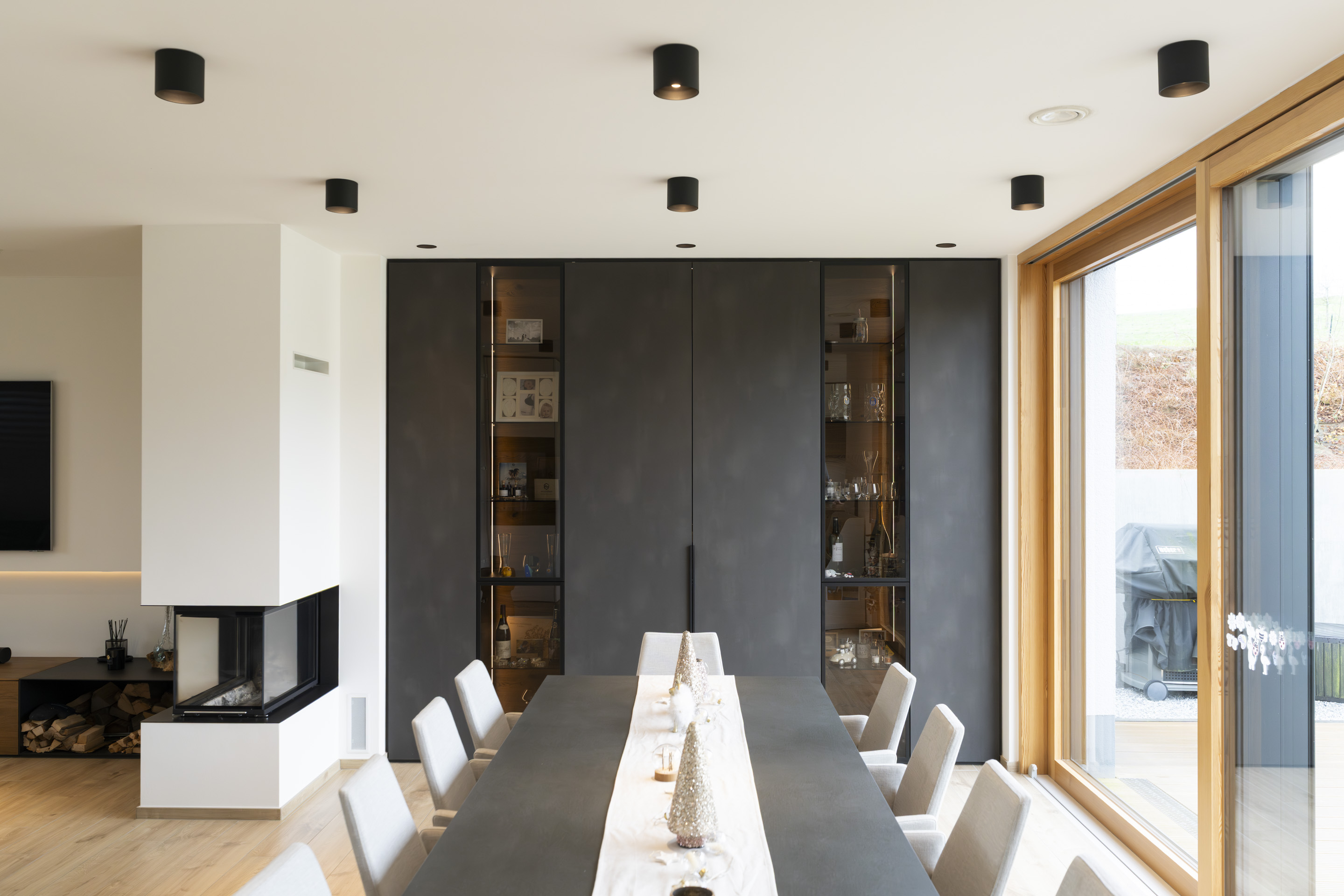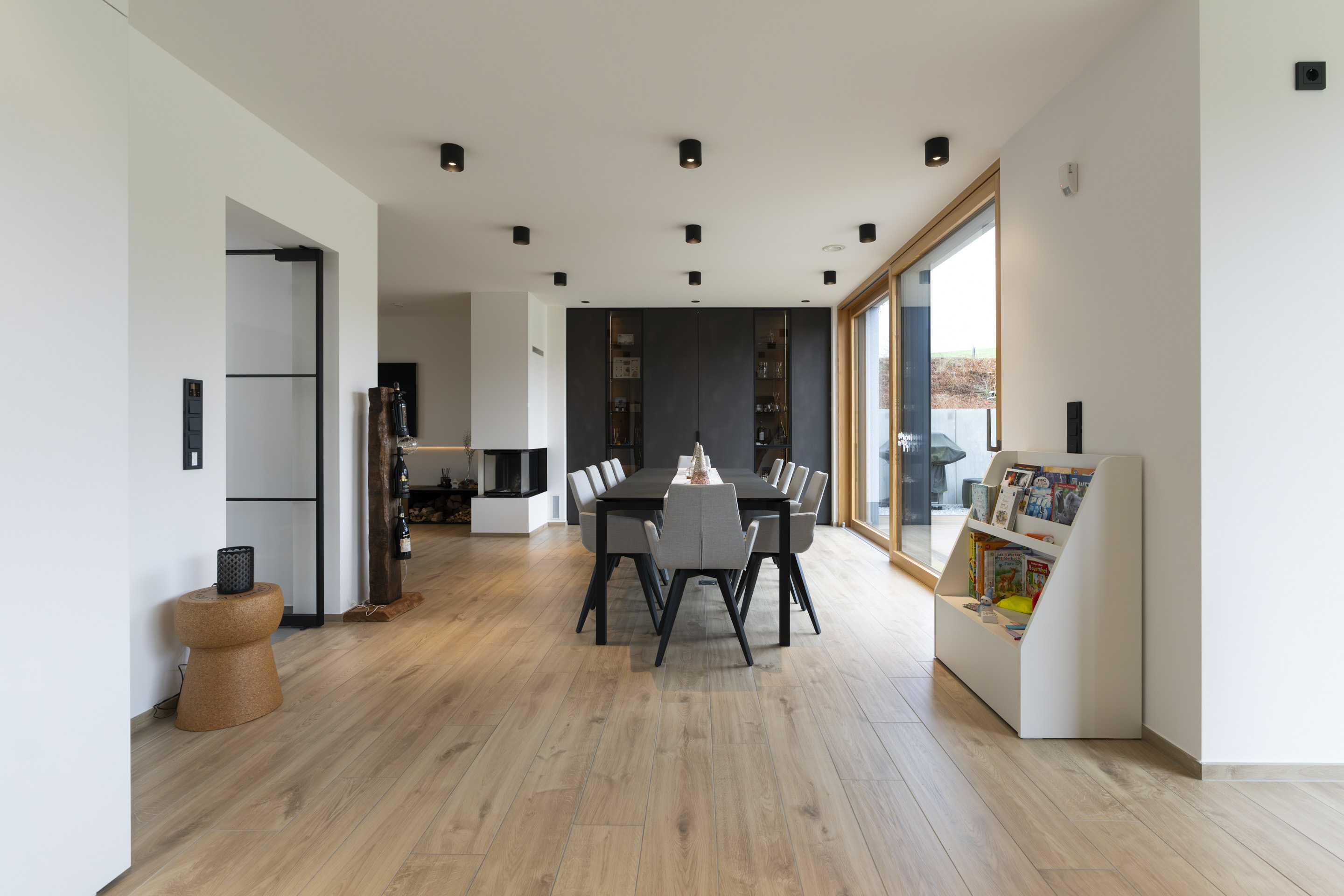 Im Erdgeschoss öffnet sich der Wohnbereich über raumhohe Hebe-Schiebe-Elemente zur Terrasse und verbindet Innen- und Außenraum nahtlos. Hochwertige Materialien, ein zentral platzierter Kamin und bewusst gesetzte Lichtakzente geben den Räumen Struktur und Tiefe.