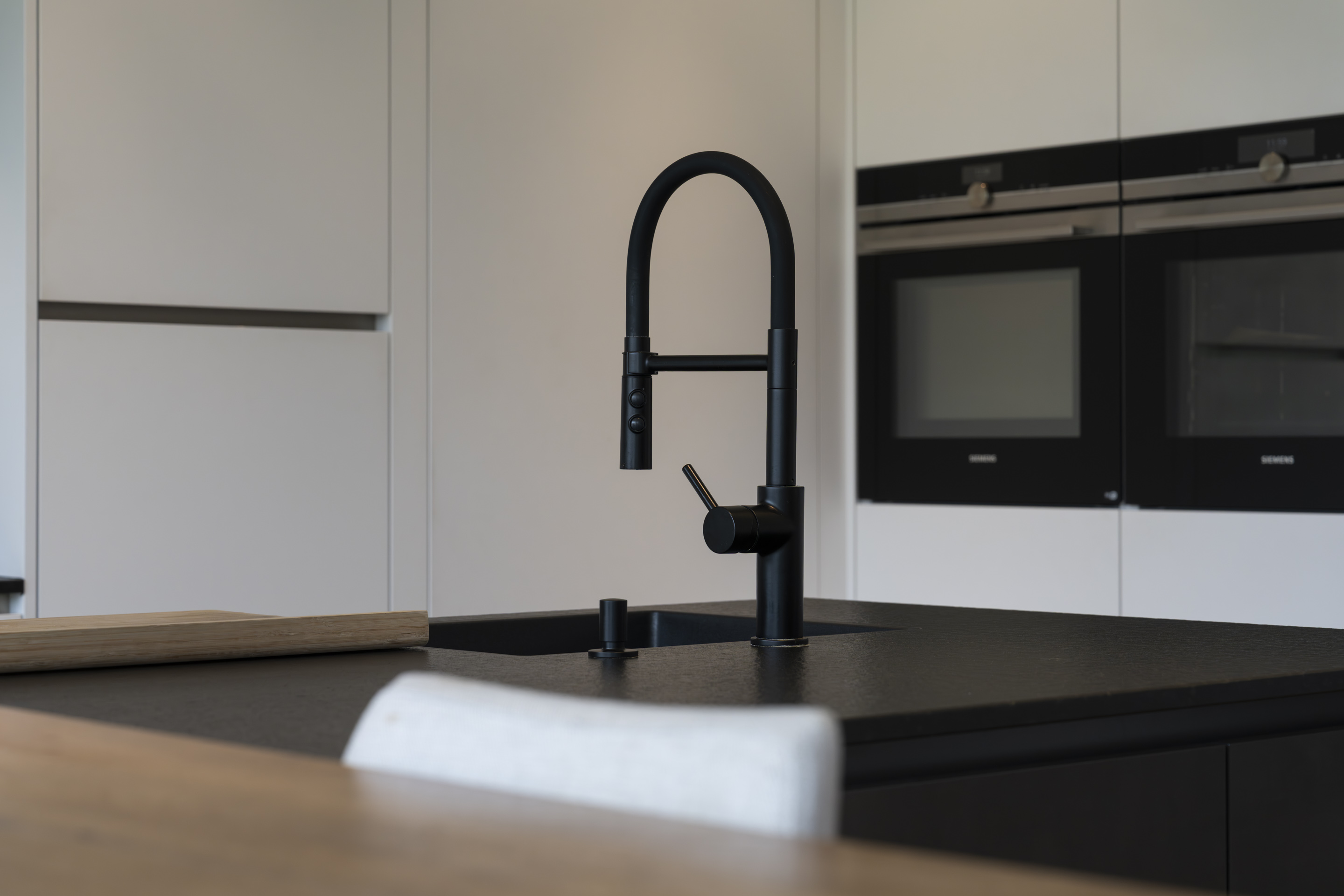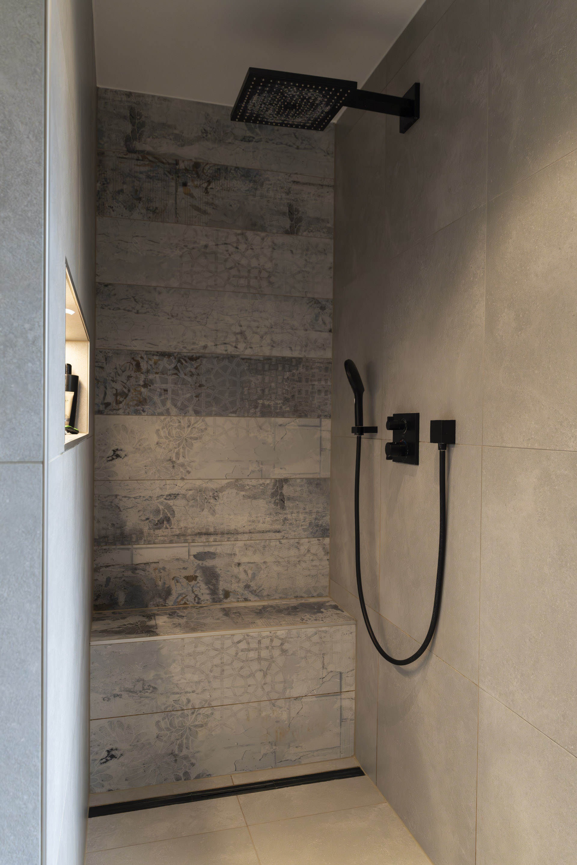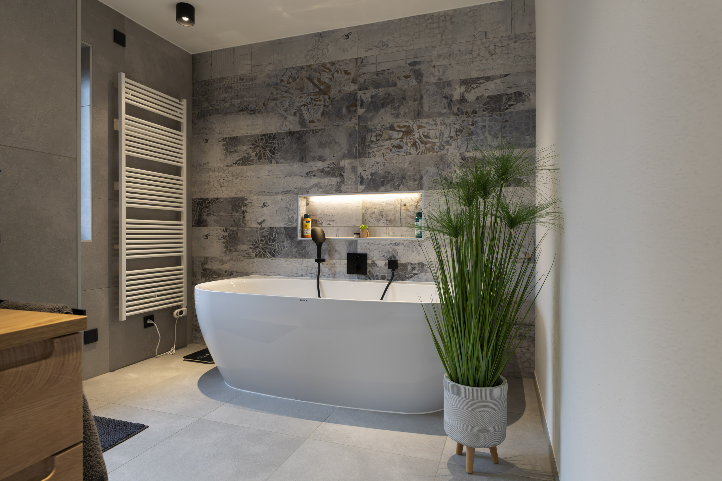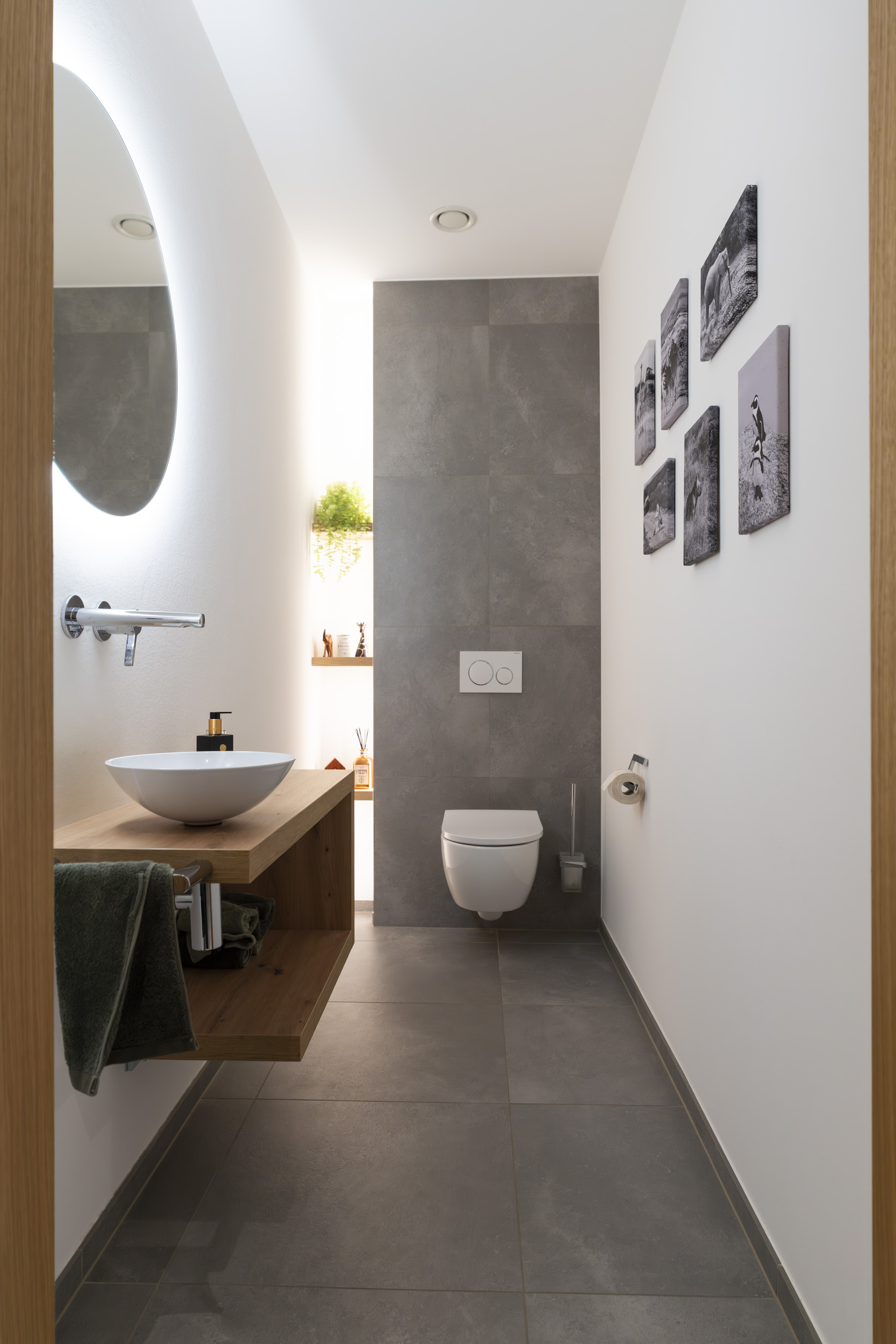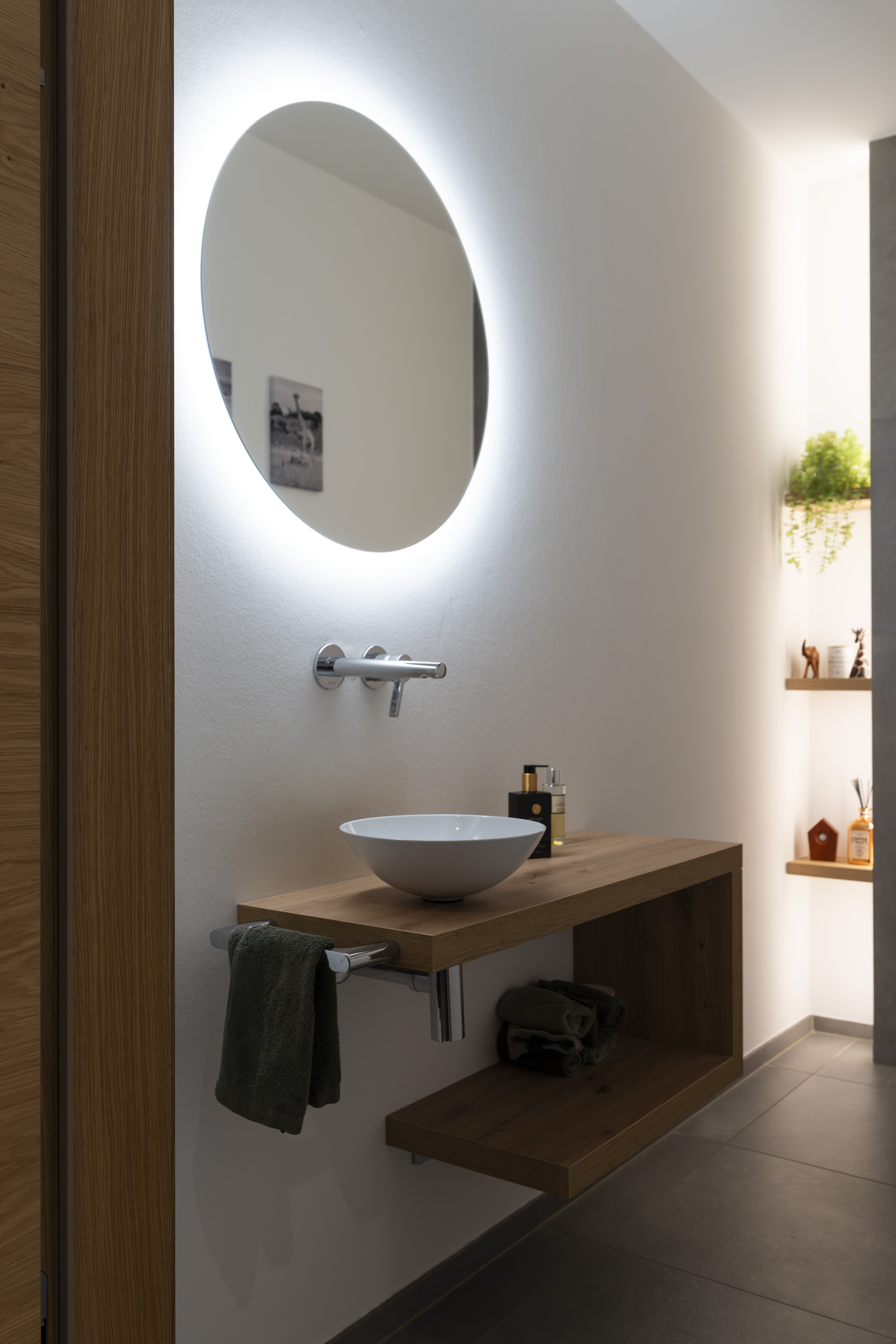 Im Erdgeschoss öffnet sich der Wohnbereich über raumhohe Hebe-Schiebe-Elemente zur Terrasse und verbindet Innen- und Außenraum nahtlos. Hochwertige Materialien, ein zentral platzierter Kamin und bewusst gesetzte Lichtakzente geben den Räumen Struktur und Tiefe.
