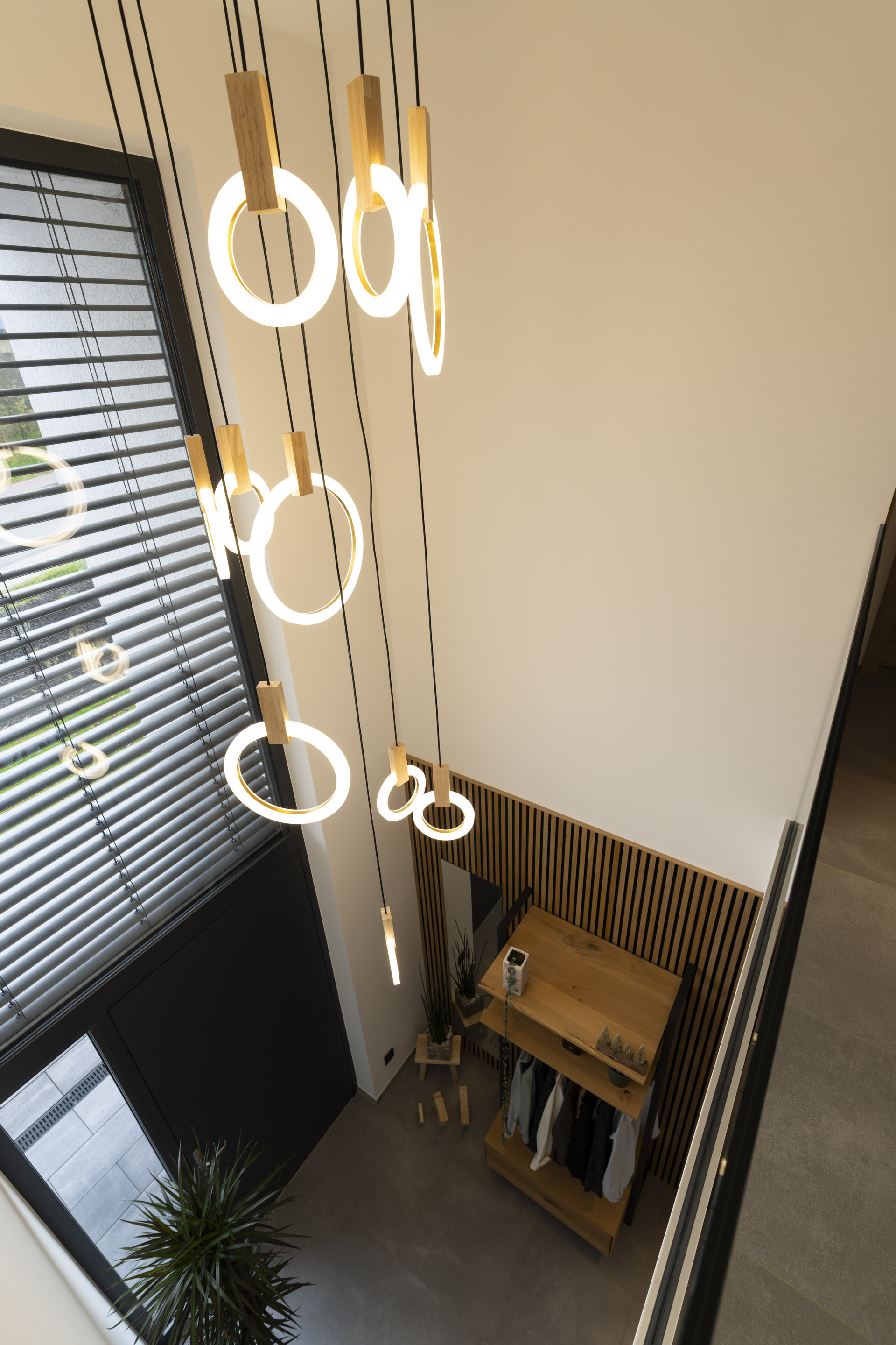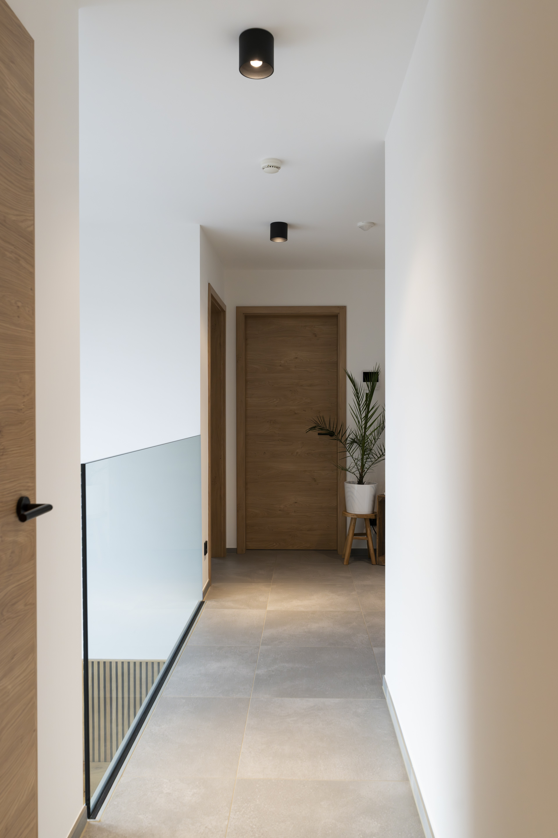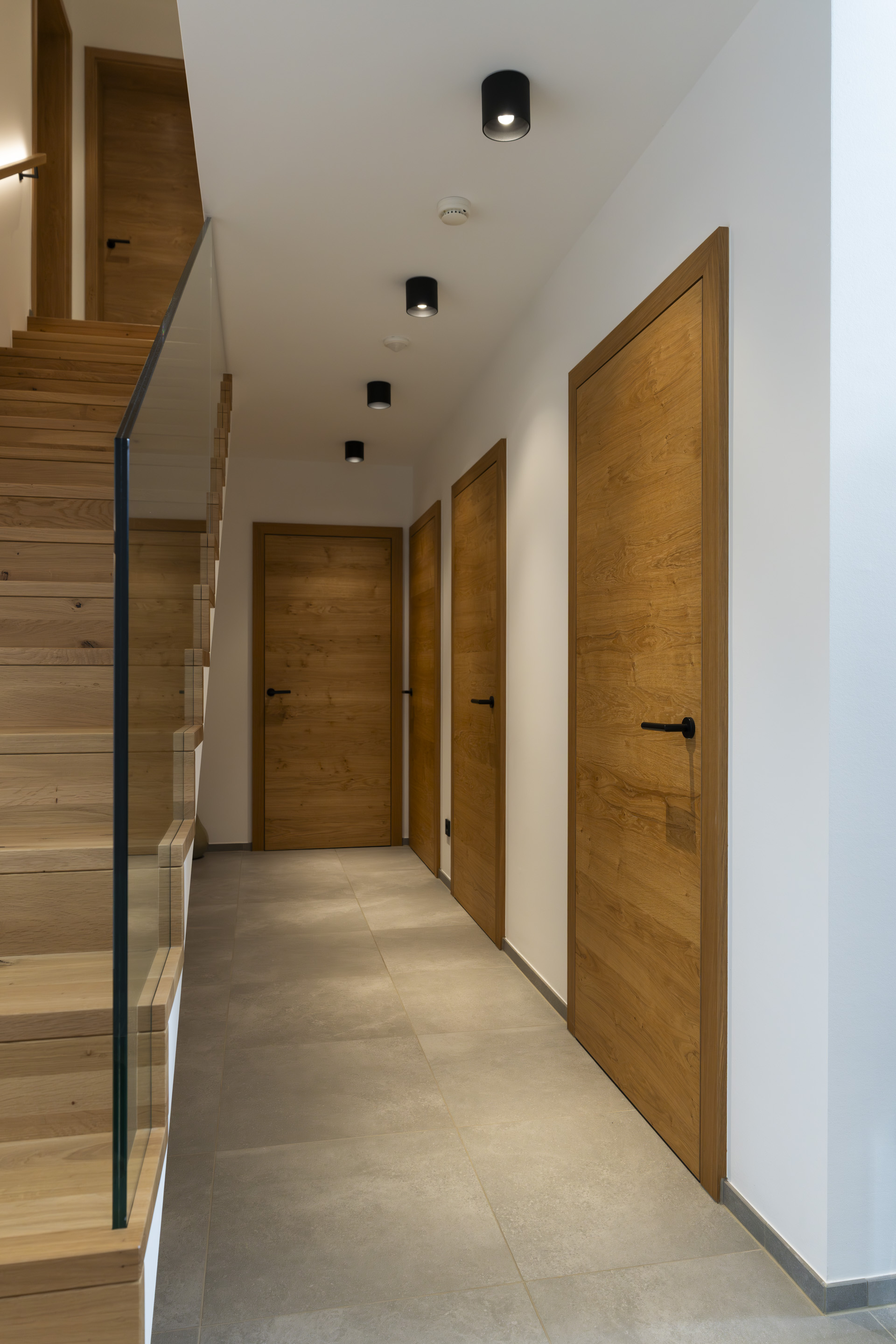 Der Eingangsbereich mit offener Galerie und filigranem Glasgeländer schafft Weite und verbindet die Ebenen elegant miteinander. Haustür, großflächige Fensterelemente und die abgestimmte Fassadenbekleidung sorgen für eine klare, moderne Erscheinung.