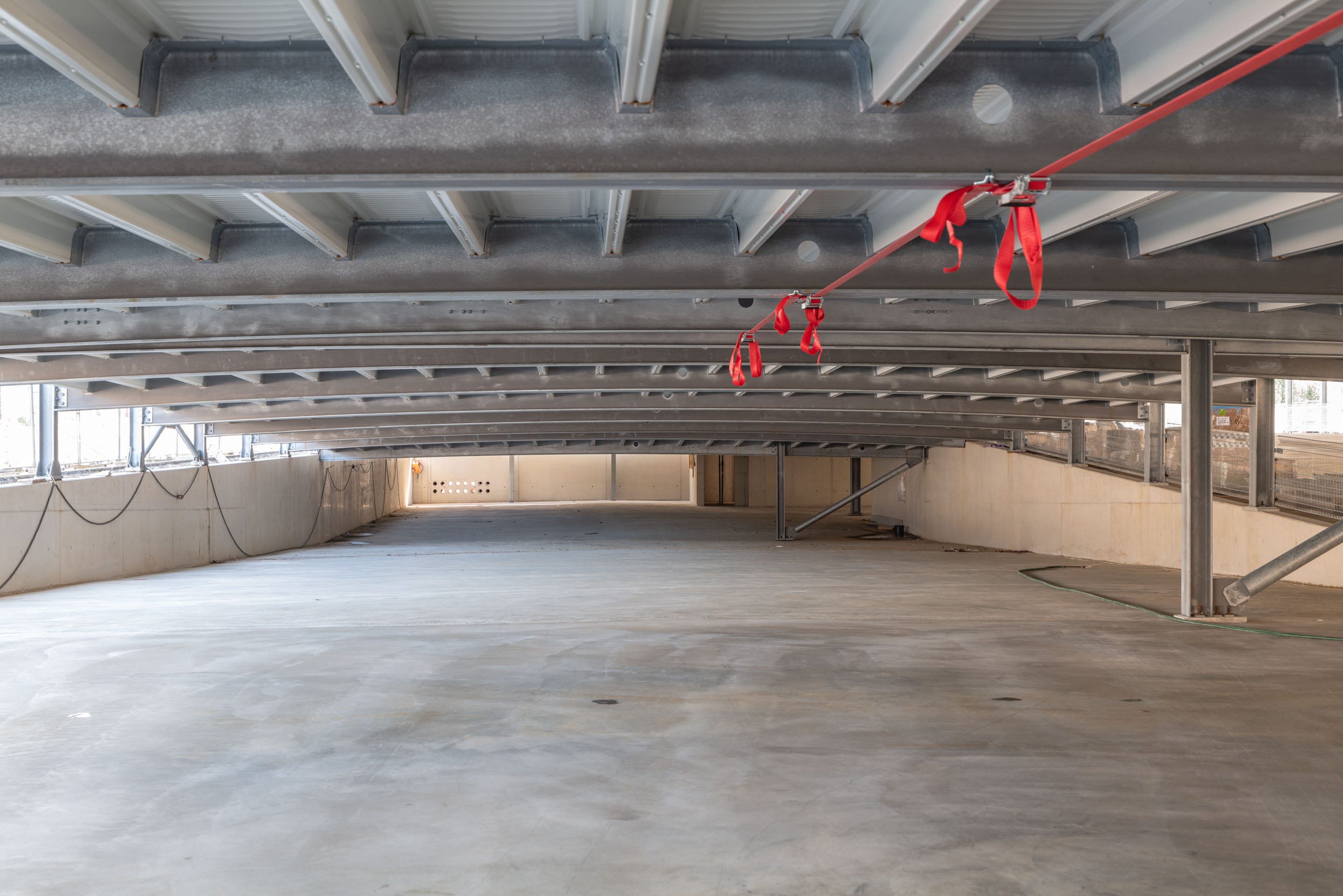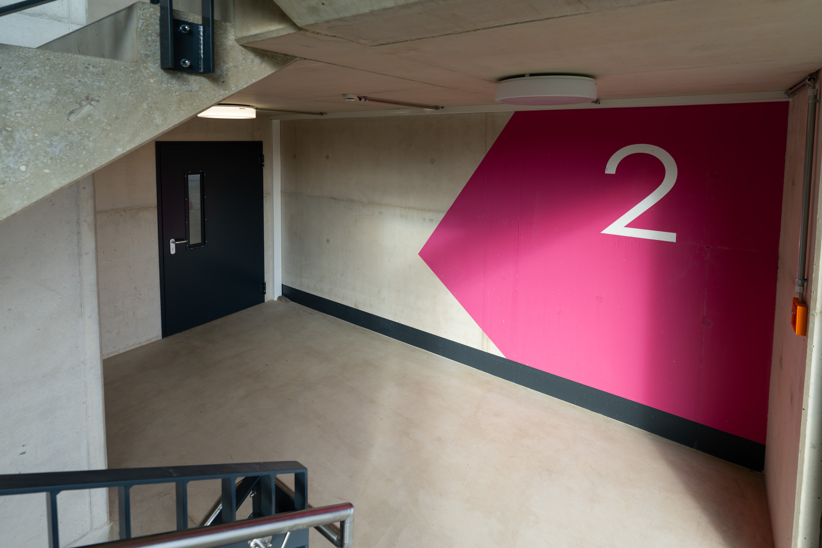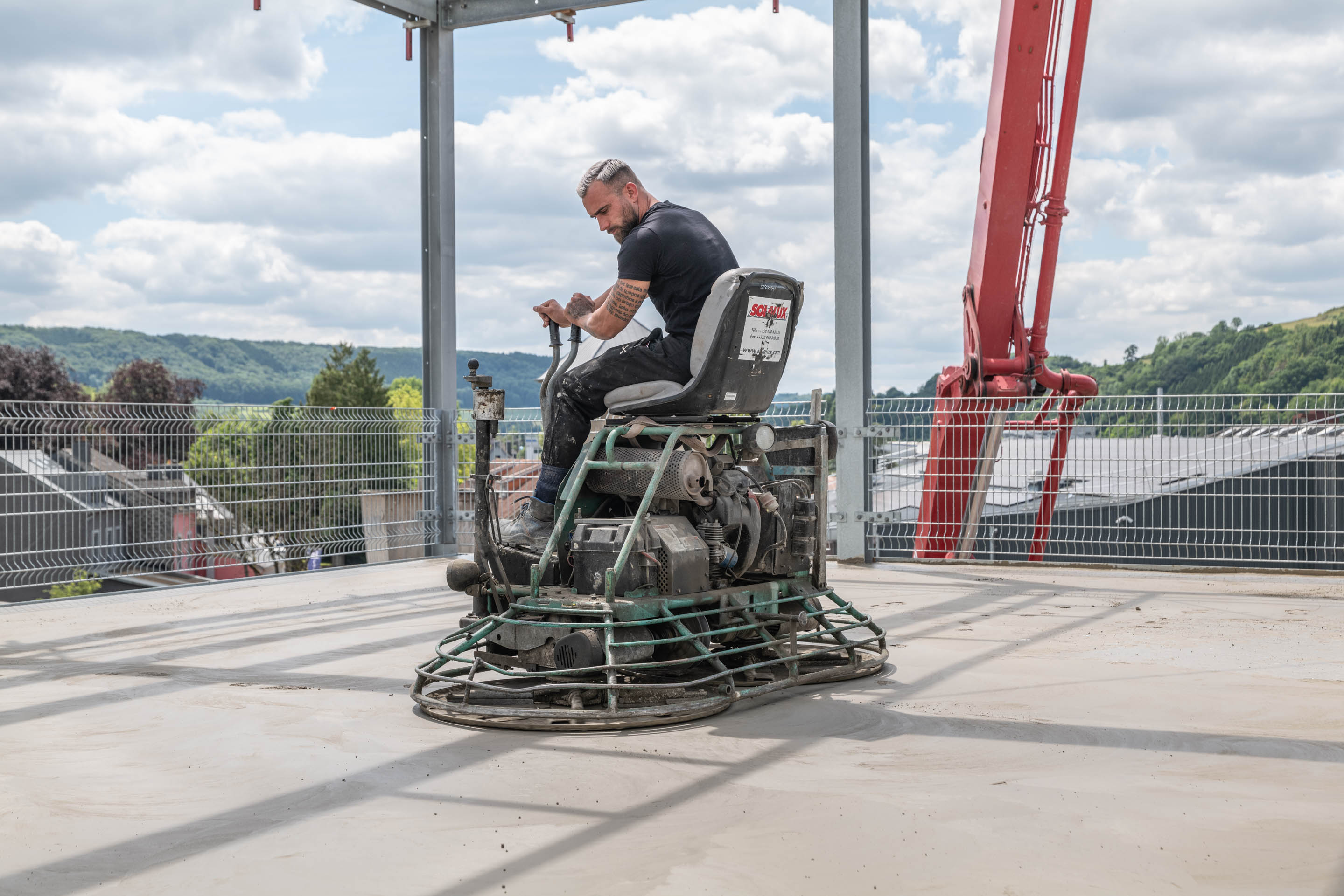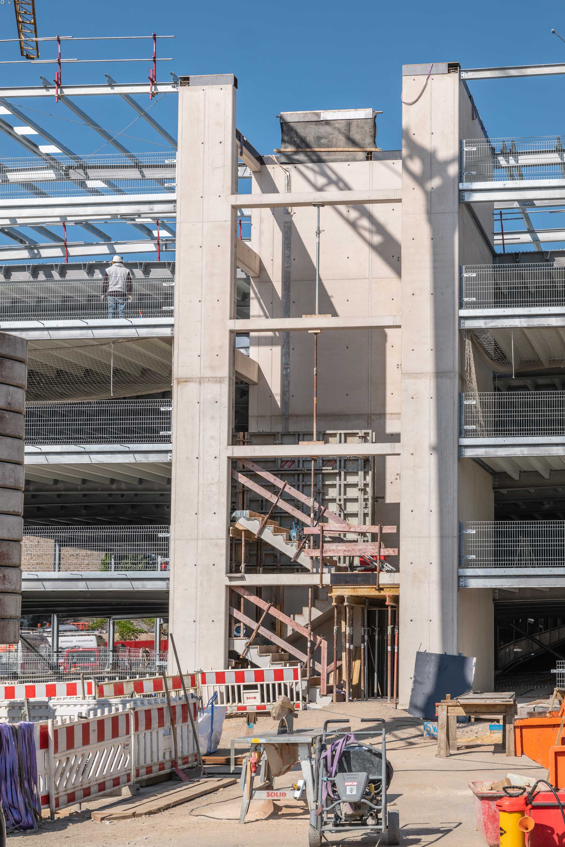 Unsere Leistungen umfassten die Bohrpfahlgründung, die Erd- und Stahlbetonarbeiten, die wir in Zusammenarbeit mit Mabilux ausgeführt haben, sowie die Außenanlagen. Die Treppenhäuser wurden in SOLID Sichtbetonqualität ausgeführt, während die Parkdecks durch unsere Kollegen von Solalux geglättet wurden.