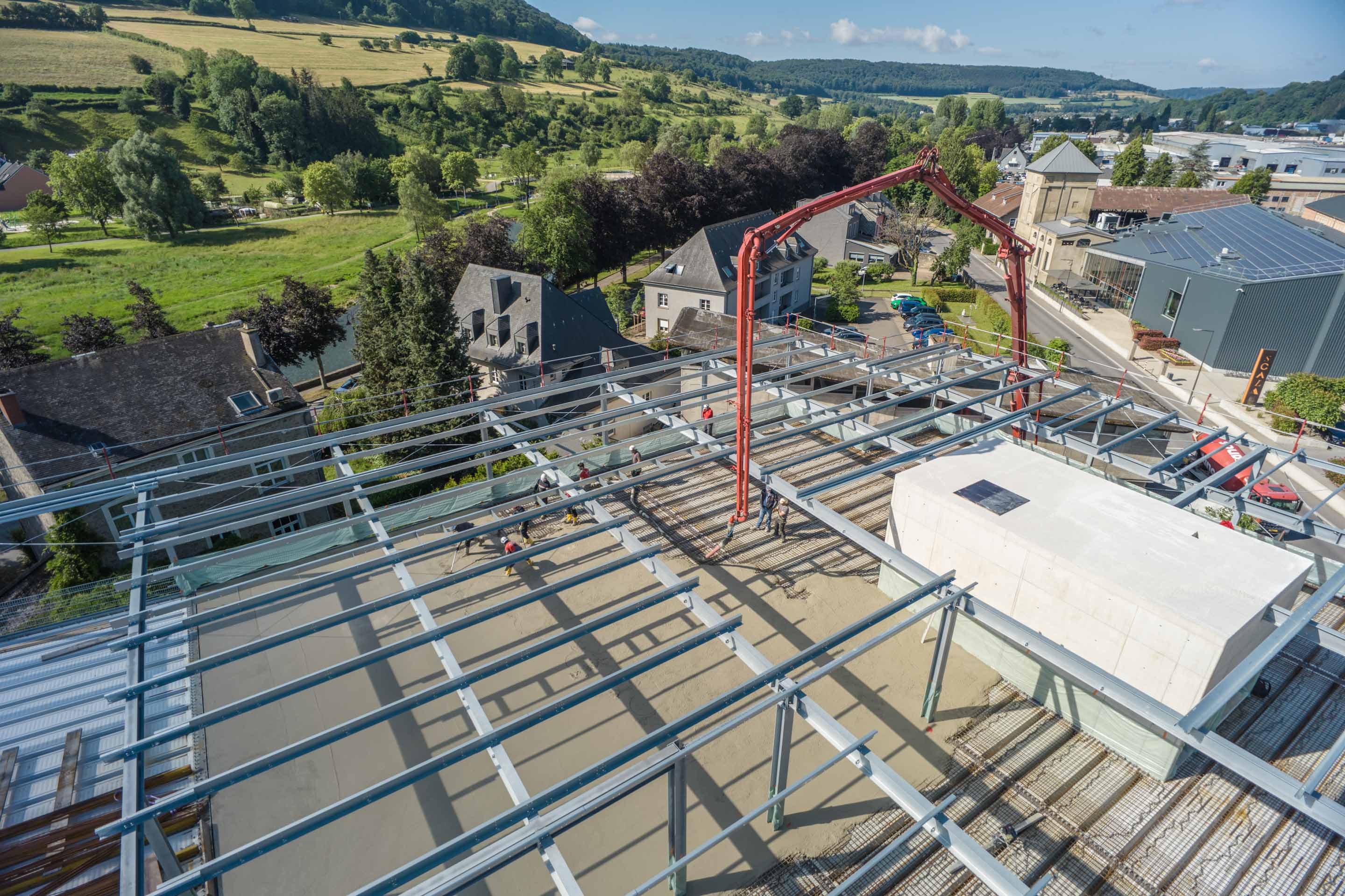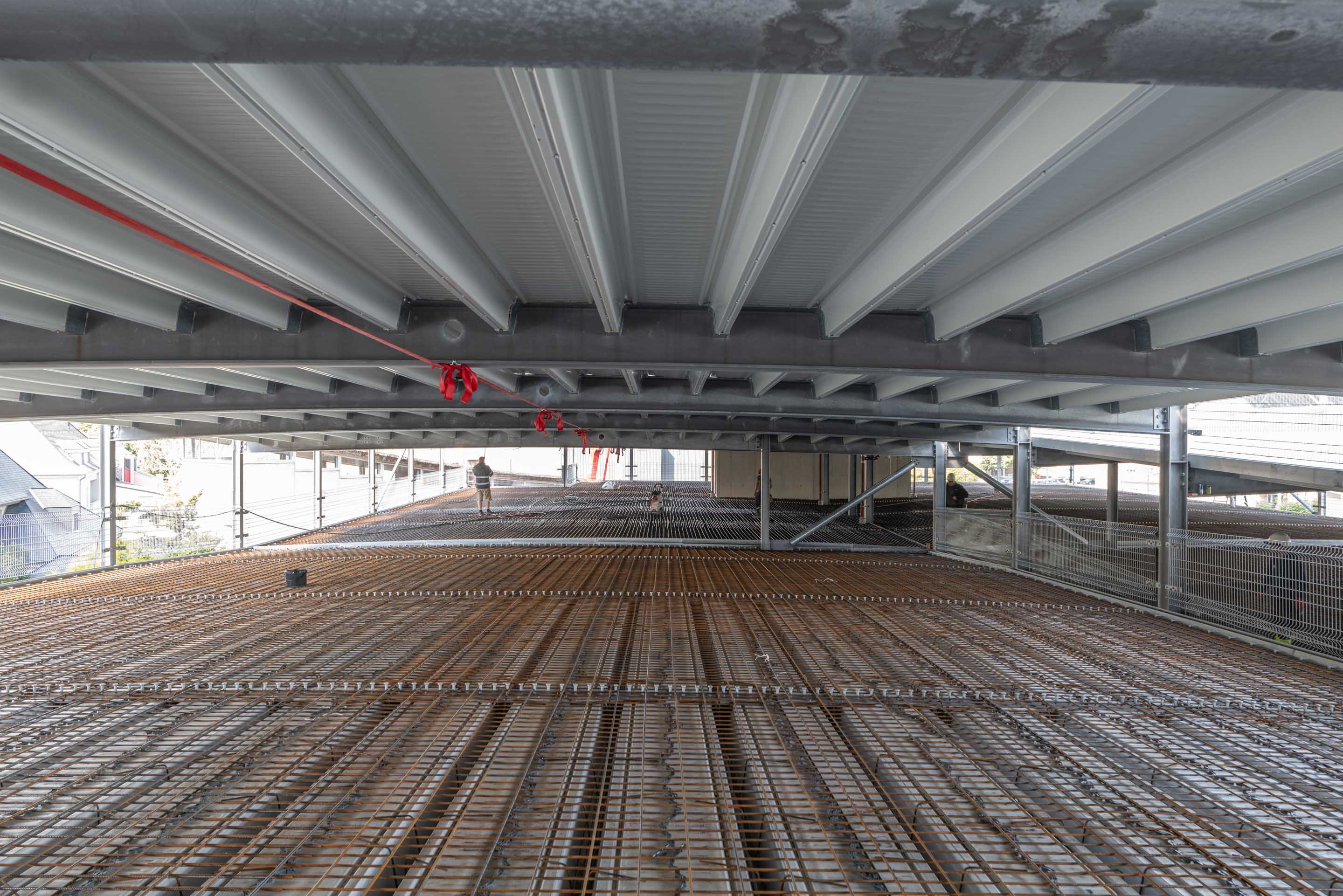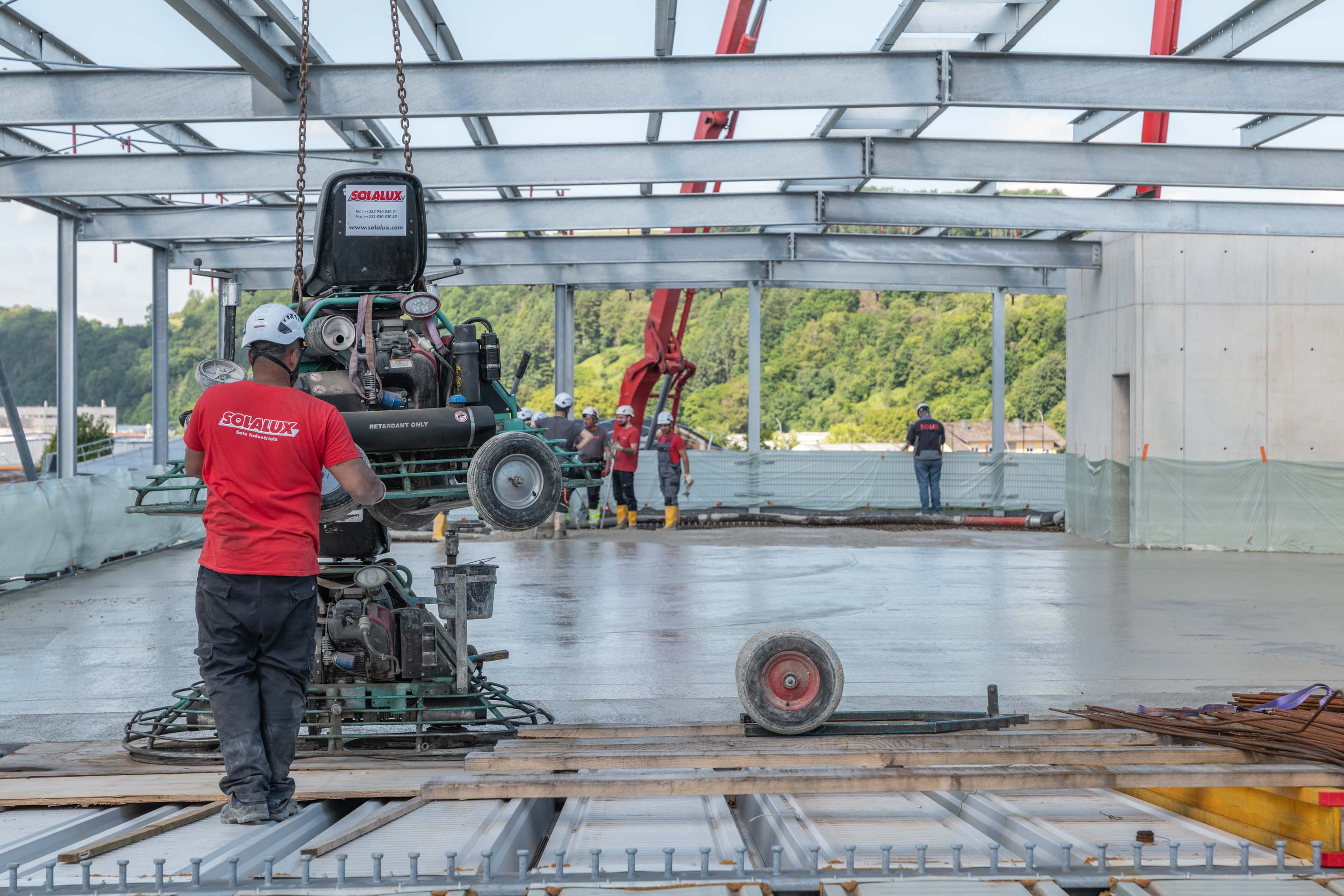 Unsere Leistungen umfassten die Bohrpfahlgründung, die Erd- und Stahlbetonarbeiten, die wir in Zusammenarbeit mit Mabilux ausgeführt haben, sowie die Außenanlagen. Die Treppenhäuser wurden in SOLID Sichtbetonqualität ausgeführt, während die Parkdecks durch unsere Kollegen von Solalux geglättet wurden.